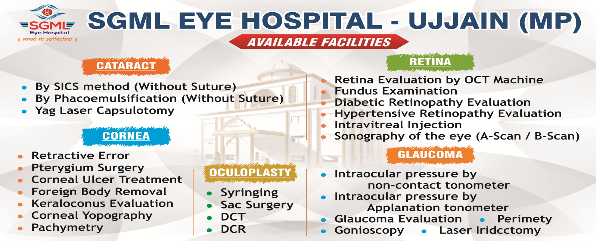 We at SGML to believe that prevention is better than cure, the human eye is one of the most valuable and sensitive sense organs. It enables us to see the wonderful world and the colors around us. In the current era the modern gadgets and lifestyle are affecting and developing eye related syndrome, to prevent this, we want to bring awareness in society and educate the people. Also we aim to reach all the class of people of society to provide the best available treatment using latest technologies and modern equipments. With this noble thought to make betterment in society, stone foundation did on 11th February 2017 and with the grace of Lord Shri Swaminarayan and Shri Mahakaleshwar along help of well wishers we are going to inaugurate the SGML eye hospital on 30th January 2023 in rural area of Ujjain, Madhya Pradesh.
